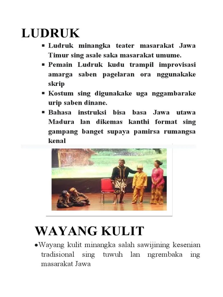 Salah satu teater daerah yang ada di indonesia adalah ludruk yang berasal dari daerah jawa timur. ludruk merupakan pementasan seni drama yang bersifat tradisional yang dimainkan oleh kelompok kesenian diatas panggung. Sebuah bentuk teater yang mengandung unsur utama berupa dialog, tembang dan dagelan dengan diiringi oleh gamelan. Seni tradisional dalam bentuk permainan terdiri. Tirto.id ludruk merupakan kesenian tradisional di jawa timur.